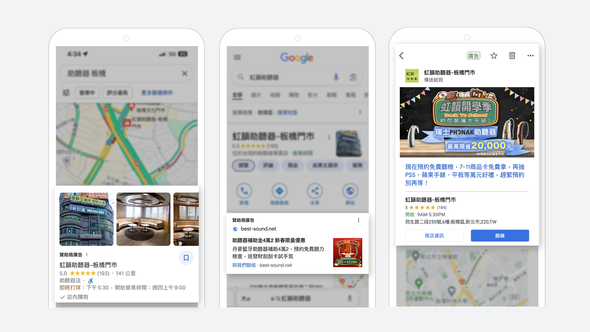 Google 地圖廣告可追蹤消費者在瀏覽廣告後點擊「致電」或「取得路線」次數,並透過定位紀錄以確保隱私安全的方式,將客戶的「親臨門市」次數記錄於廣告中。