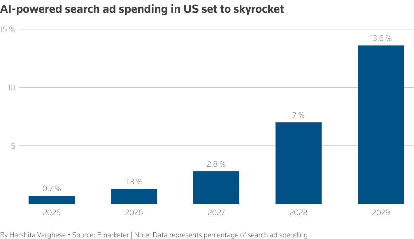 A:根據 eMarketer 預測,美國市場的 AI 搜尋廣告支出將從 2025 年的 10 億美元,成長至 2029 年的近 260 億美元。這顯示品牌越來越依賴 AI 來提升廣告精準度、互動率與效率,並進一步改變使用者的搜尋與轉換路徑。