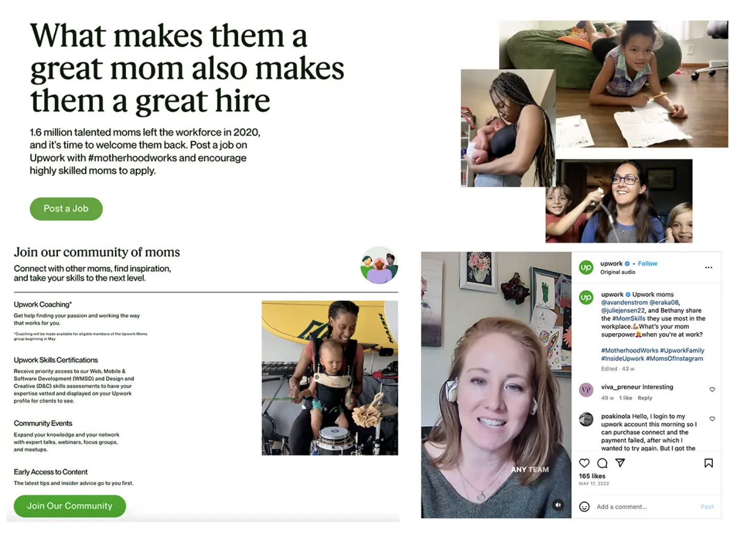利用使用者生成的內容:Upwork通過以 #motherhoodworks 為標籤的社群媒體活動,鼓勵媽媽們分享她們作為職業媽媽的個人經歷,並強調她們透過育兒獲得的技能如何在職場上發揮作用。Upwork將這些故事重新發佈在他們的社群媒體平台上,以貼文和影片形式呈現,獲得了極大的迴響。