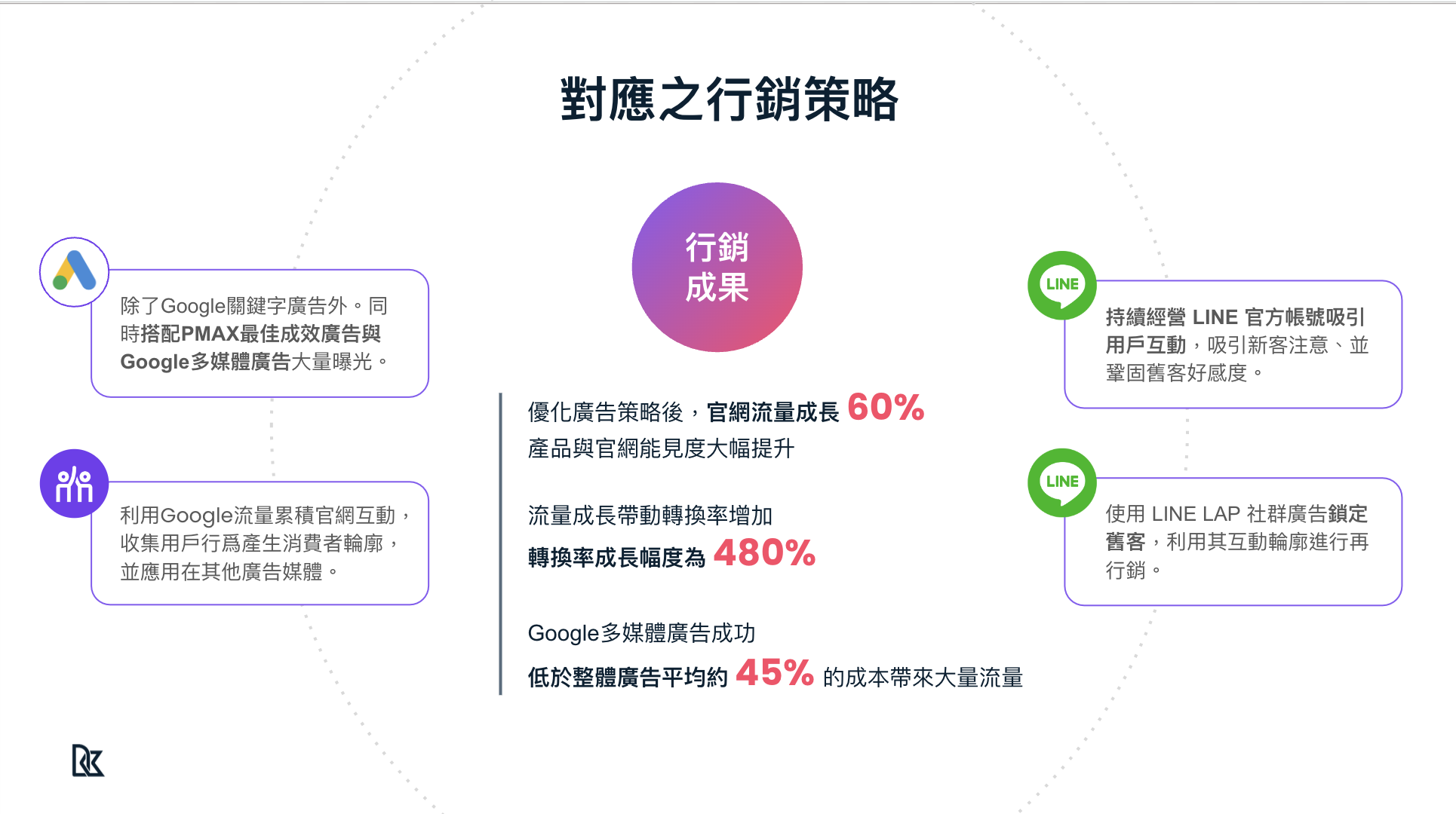 在初期探索市場時,我們的行銷策略優先採用「搜尋廣告」,將 Gelovery 曝光給有需求的潛在客戶。不論是購物初期的資訊搜尋,還是競品的關鍵字,都不放過任何一次曝光,增加 Gelovery 產品與潛在用戶溝通的機會。經過一段時間的優質流量積累後,我們建議客戶擴大觸及範圍,利用 Google PMAX 和多媒體廣告大量曝光,並結合「智慧型購物廣告」進行推廣。這種廣告方式能結合官網的產品資訊,針對即時價格和產品說明等,在熱門位置進行曝光。我們利用廣告流量積累了大量的購買行為,並將 CRM 資料同步應用在 LINE LAP 再行銷廣告中進行學習。同時,將每次活動累積的數據應用到其他產品線,使後續的行銷活動更具效果。