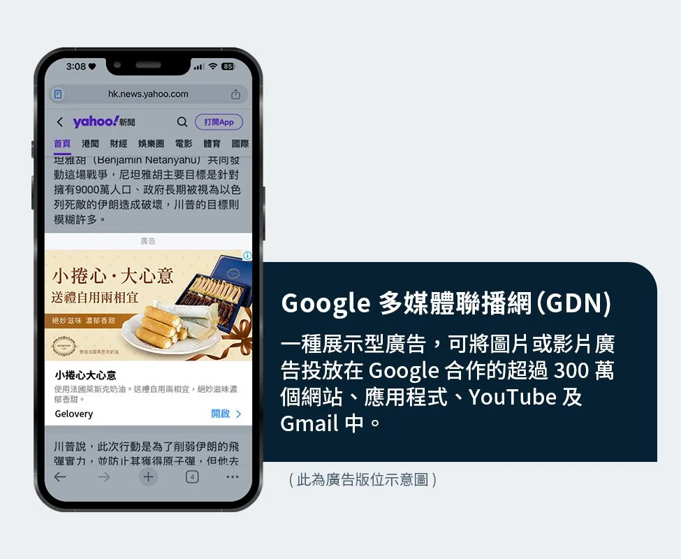 「視覺」絕對是吸引消費者的首要關鍵!而為了能讓 Gelovery 的點心系列快速吸引用戶注意,我們在行銷漏斗初期即透過擁有眾多人氣版位的 Google 多媒體聯播網廣告(後簡稱 GDN)大量曝光,其圖片格式的主動曝光型廣告,能有效加強產品與消費者宣傳的機會,同時 GDN 廣告能有效降低點擊成本,也因此替官網帶來巨額流量,並累積大數據資訊。