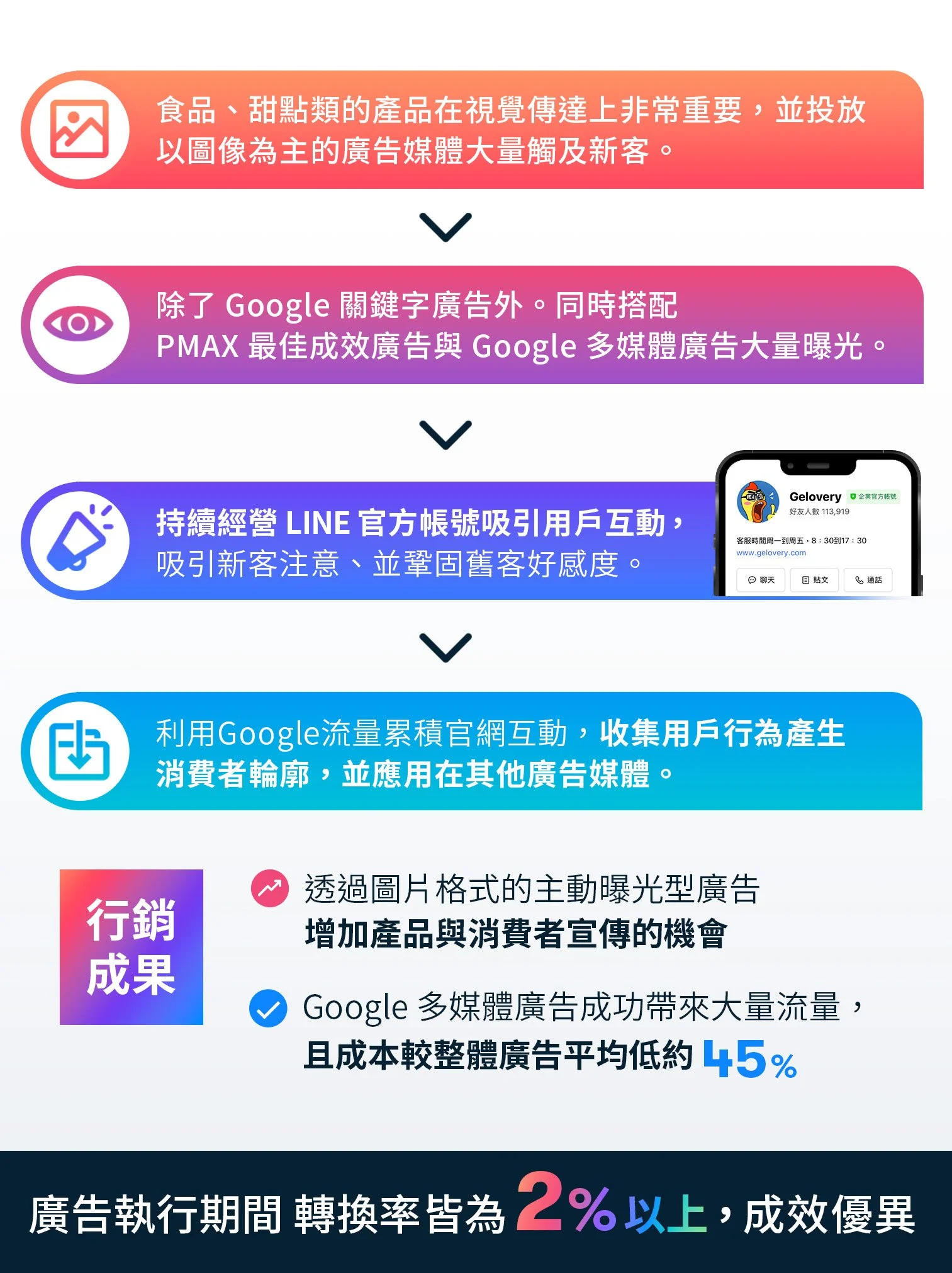 我們利用 GDN + LINE LAP 替 Gelovery 的全新產品線在短時間內高度曝光,並帶來大量潛在新客。這些被導到官網的流量我們收集使用者行為後,再輔以 Google 與 LINE 的數據量體與學習投放再行銷並搭配類似受眾,用較低的成本帶來可觀的營收與產品知名度。