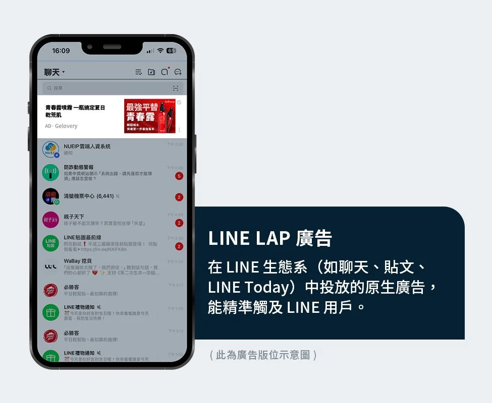 除了 Google 廣告的大量曝光特性以外,我們也搭配了 LINE LAP 的多媒體廣告進行投放。