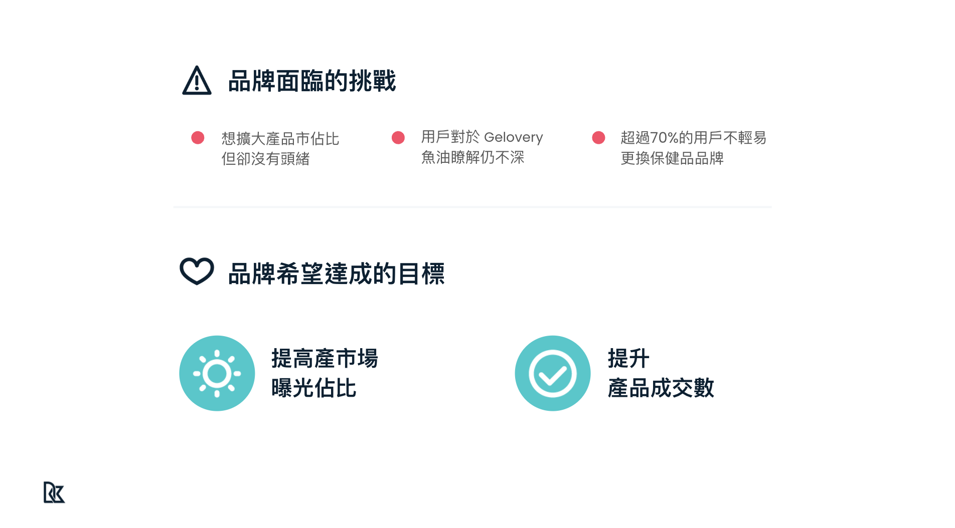 Gelovery 這個品牌在早期是以美味高品質的生乳捲著稱,在網購市場中聞名天下。這一兩年來積極跨足其他領域,如食品零嘴、美妝保養等等。近期他們以「德國KD頂級高濃度魚油」爲核心產品進軍保健品市場。根據 Google 在 2023 年的一份調查報告指出,有超過 70% 的民衆習慣使用固定品牌的保健品。而且魚油在臺灣已有領導品牌,競品累積粉絲已行之有年,消費者的品牌忠誠度非常高,極不利新品牌切入。
