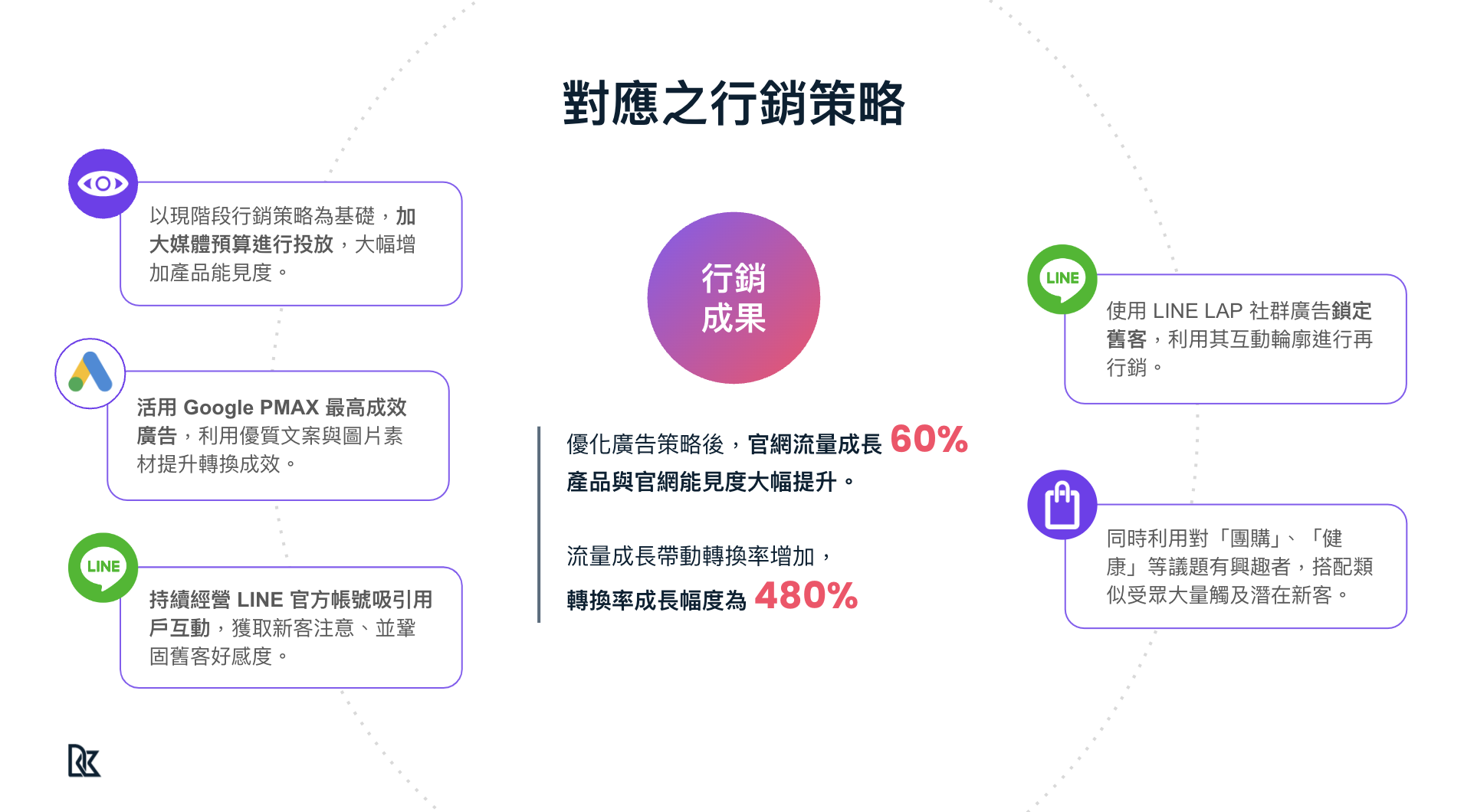 在LINE LAP的佈局上我們在受衆上與行銷初期目標相比也做了微調。除了原本核心的「健康」、「醫美」、「團購」受衆外,也新增了網購行為偏好、更擴大了與健康相關興趣設定,吸引更廣泛的潛在顧客。受益於 PMAX 廣告與 LINE受衆的更新,讓原本成效還不錯的「再行銷 + 類似受衆」在曝光、轉換等數據上都有更一步令人驚豔的表現!