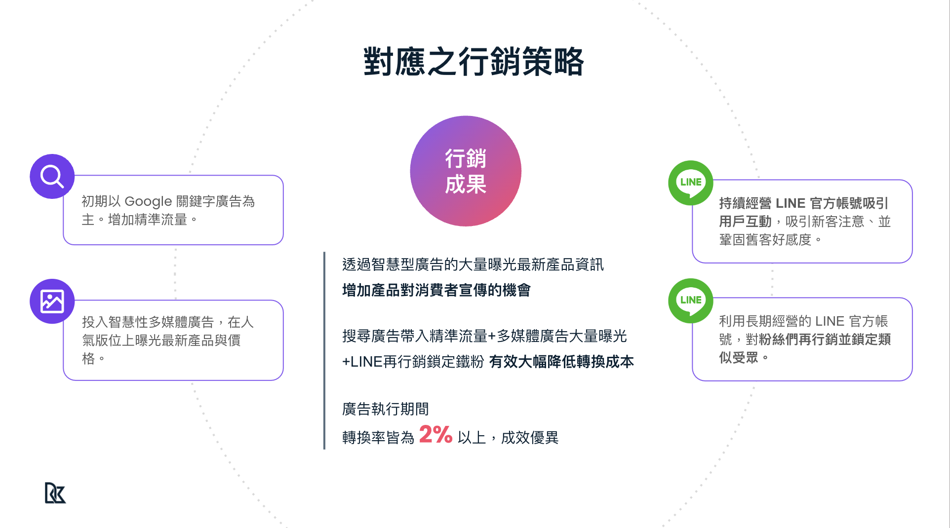 在廣告成效趨於穩定之後,我們再一次將廣告優化升級。首先是將多媒體廣告升級為智慧型多媒體廣告,從過去僅針對舊有訪客進行再行銷外,還可以透過系統學習找出對我們商品感興趣的潛在消費者,藉此拓展廣告的觸及範圍並增加與更多潛在顧客的宣傳機會。最終加入以目標為導向的 Google PMax 最高成效廣告,藉由系統 AI 信號為客戶找到更多潛在客戶。